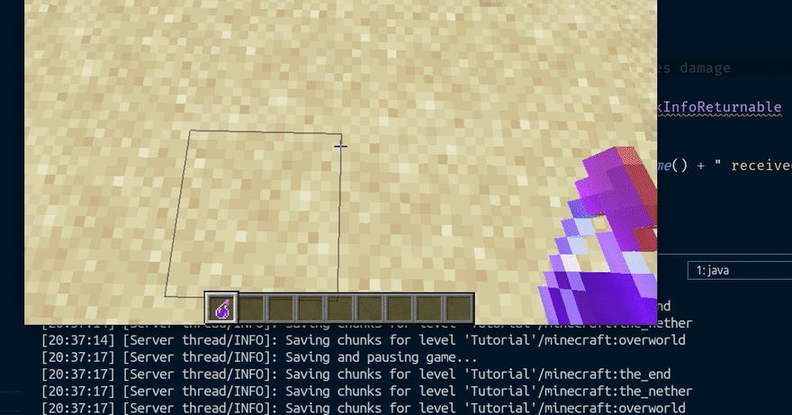 Now execute the command ./gradlew runClient in the console, launch a Minecraft world in creative mode, grab some instant damage potions and try to get hurt.
